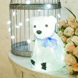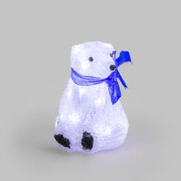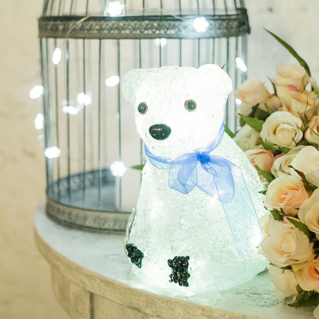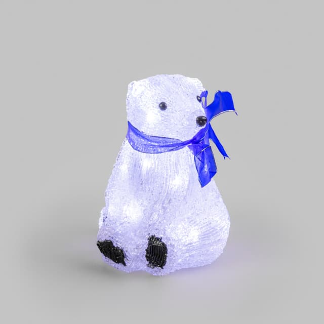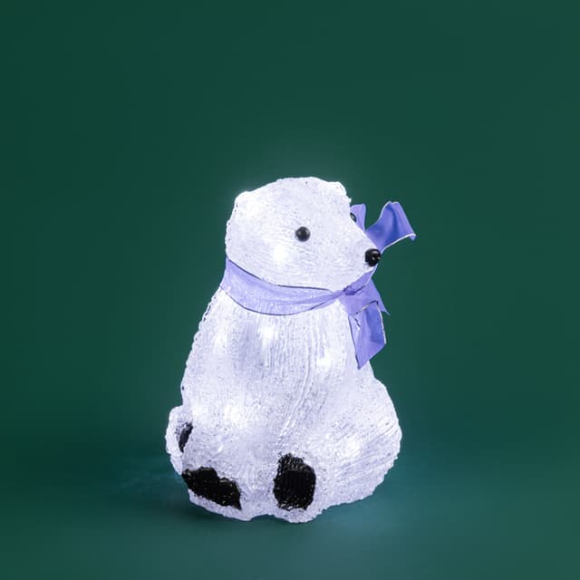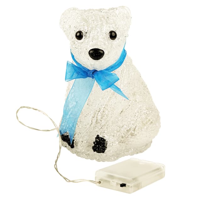 Акриловая светодиодная фигура «Белый мишка» высотой 20 см — яркий, светящийся интерьерный декор, выполненный из акрила и металлического каркаса. Внутри располагаются 20 диодов белого свечения. Технология нанесения материала формирует фактурную поверхность, имитирующую бархатистую шерсть животного. Батарейный блок, расположенный на конце 20-сантиметрового кабеля рассчитан на установку 3 элементов питания типа АА. Светодиодный декор на батарейках абсолютно безопасен и отлично подходит для украшения детских комнат.