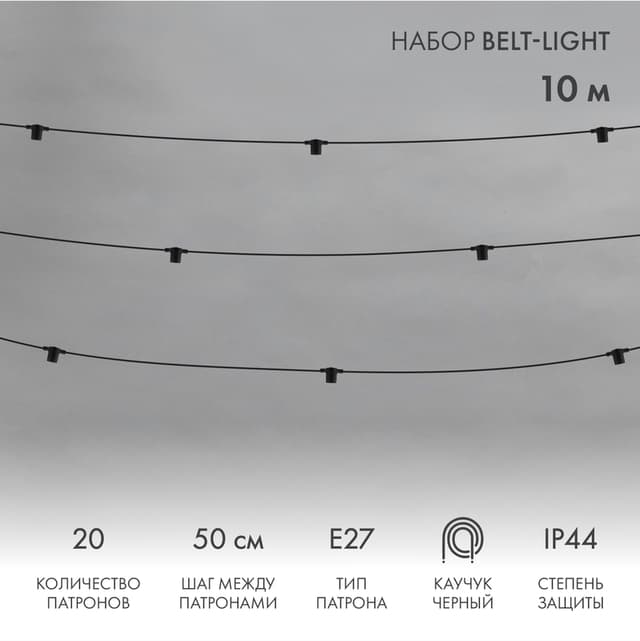 «Белт-Лайт» – популярная гирлянда для украшения фасадов домов, зданий, создания перетяжек между деревьями, столбами. Также такие гирлянды широко используются в украшении кафе, ресторанов, на свадебных площадках и в фотозонах. 10-метровый шнур оснащен 20 патронами с цоколем Е27. Патроны располагаются на иллюминационном кабеле с шагом 50 см. Для подключения к сети предусмотрен 3-метровый шнур с евровилкой. Для удобства использования предусмотрена возможность соединения гирлянды до 4-х комплектов. Провод находится в надежной изоляции из морозостойкого каучука. Вся конструкция защищена от влаги и пыли по стандарту IP44, поэтому предполагается размещение как дома, так и на улице. Гирлянда длиной 10 метров станет прекрасным украшением интерьера или экстерьера.