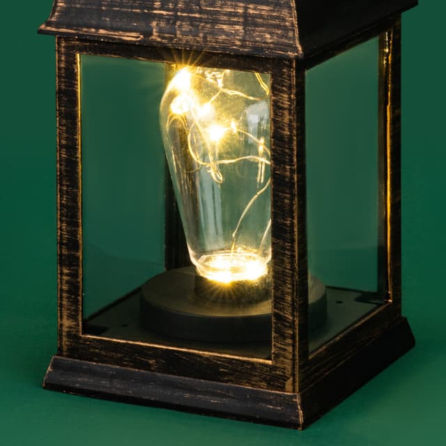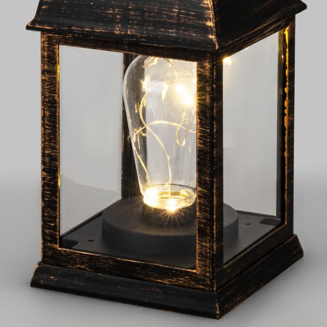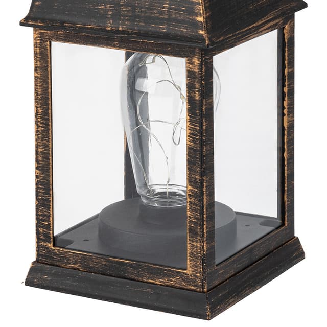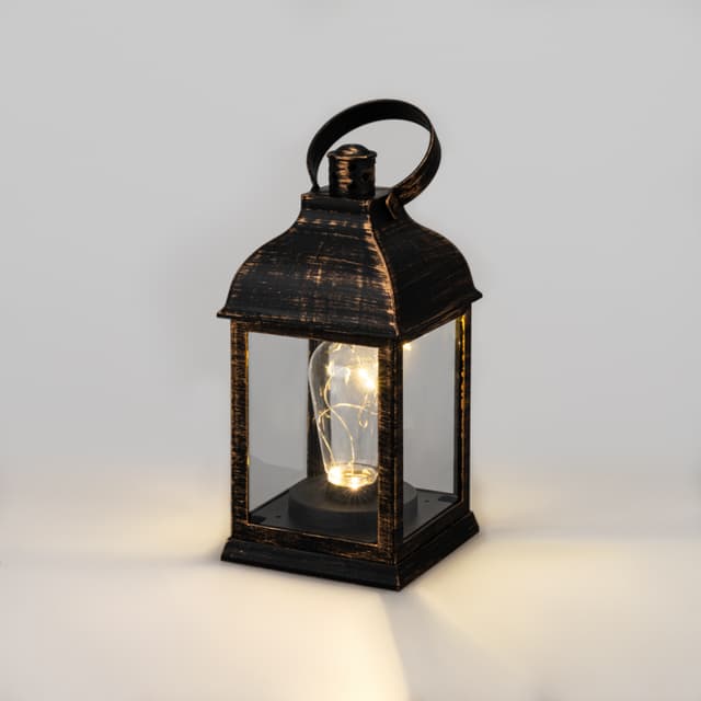 Декоративный фонарь с лампочкой — стильное, оригинальное интерьерное украшение, которое выгодно подчеркнет уникальный стиль обстановки и создаст уют. В бронзовом корпусе находится декоративный элемент в виде лампы накаливания, но вместо вольфрамовой спирали за подсветку отвечают светодиоды, излучающие белый свет теплого оттенка. Светодиоды получает питание от 3 батареек типа ААА и экономно расходуют заряд. Фонарь имитирует работу настоящей лампочки, даря тепло и комфорт окружающим.