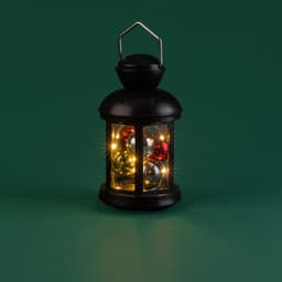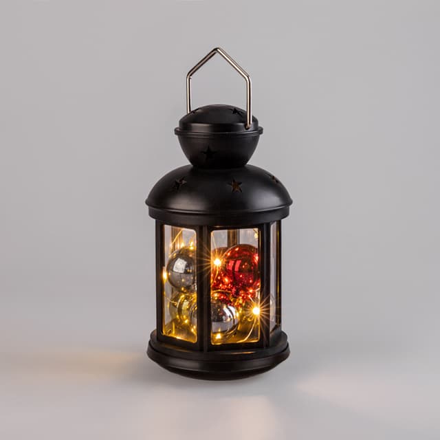 Декоративный фонарь с шариками олицетворяет тепло и домашний уют в преддверии Нового года, помогает сделать домашние вечера в кругу семьи комфортными и поднимает настроение окружающим. Оригинальное изделие в корпусе черного цвета станет стильным дополнением праздничной обстановки. Для подвешивания предусмотрено кольцо в верхней части. Экономичные диоды, подсвечивающие композицию, излучают теплый белый свет. В качестве элементов питания используются 2 батарейки типа АА, которые делают фонарь мобильным — для работы не нужна розетка.