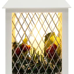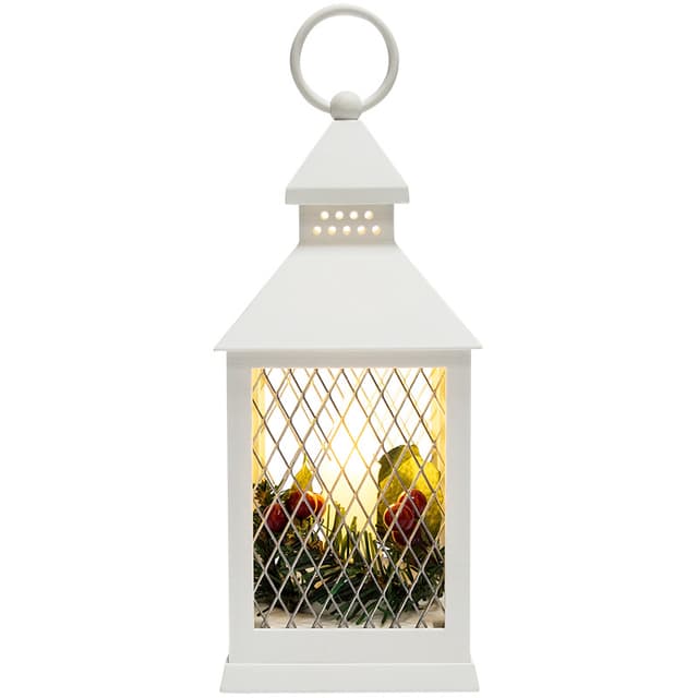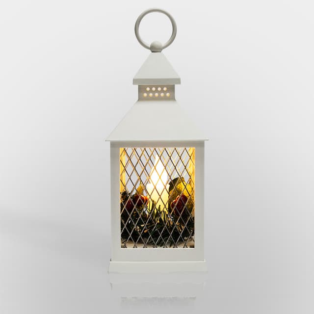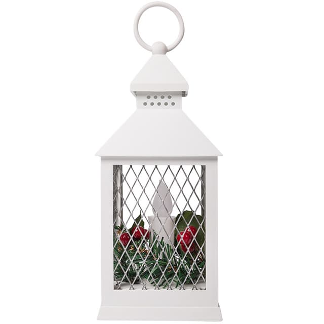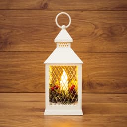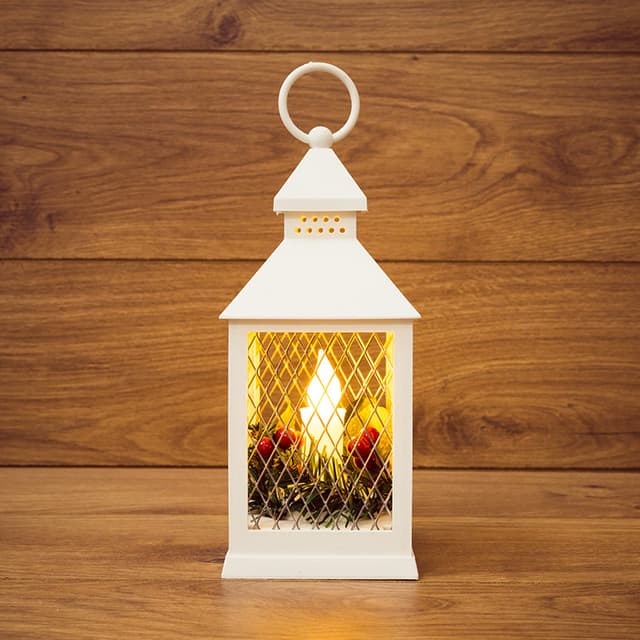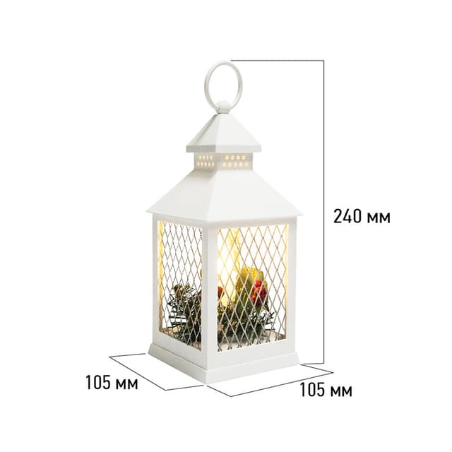Декоративный фонарь со свечкой — эффектное украшение, которое символизирует Рождество и Новый год, поэтому станет запоминающимся подарком к празднику. В белом корпусе находится оригинальная композиция с искусственными ветками ели и ягодами остролиста. А главный компонент — свеча, внутри которой спрятан 1 диод, излучающий теплый белый свет. Декоративный фонарь работает от 3 батареек типа ААА, включается и выключается при помощи кнопки на корпусе. Изделие предназначено для использования в интерьере.