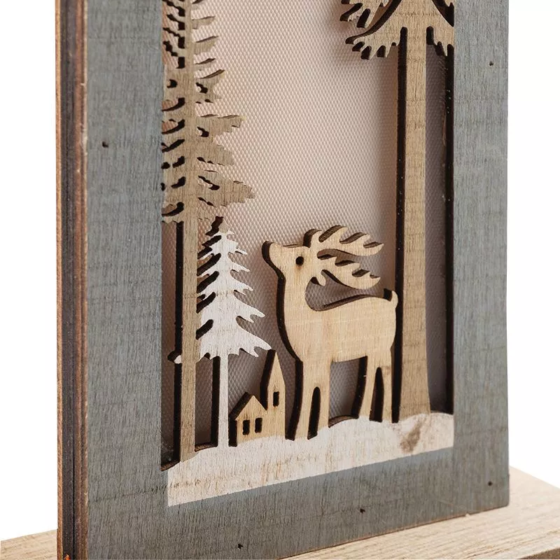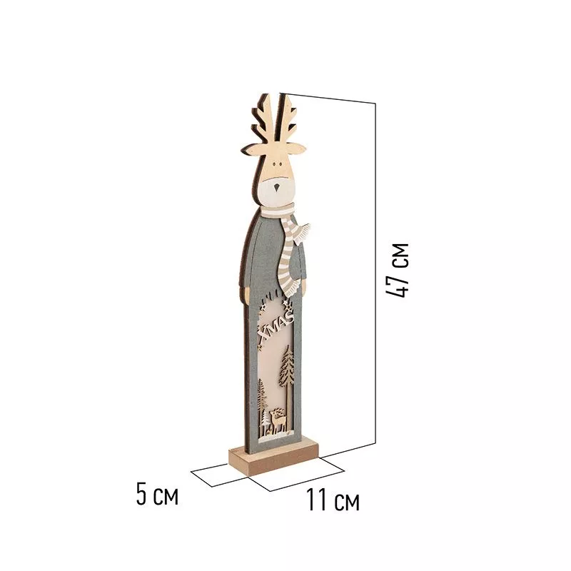 Деревянная фигурка с подсветкой «Рождественский олень» 11×5×47 см — милая интерьерная композиция, которая гармонично дополнит праздничную обстановку. Изделие произведено из природной древесины, в составе красителя нет вредных веществ — материалы гипоаллергенны и подходят для детских игр. Фигурка подсвечивается 5 яркими диодами, которые создают эффект объемных деталей и дарят ощущение тепла в холодные зимние вечера. Светодиоды работают от двух батареек типа ААА, поэтому декоративное изделие не зависит от розетки.