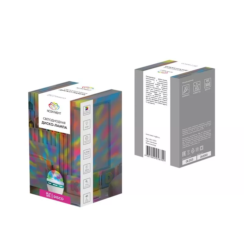 Диско-лампа с цоколем E27 — компактное устройство, которое способно создать атмосферу праздника и веселья где угодно: в квартире, на даче, в офисе или кафе. Интерьерный декор с функцией светомузыки работает от напряжения 230 Вольт: изделие можно вкрутить в подходящий по параметру патрон или установить в специальную подставку с электрическим кабелем и вилкой. Изделие выполнено в виде традиционной лампочки из белого пластика. Прозрачный купол, под которым находятся 3 диода RGB, вращается, отбрасывая разноцветные блики. Диско-лампа — это повод для вечеринки в любом месте.