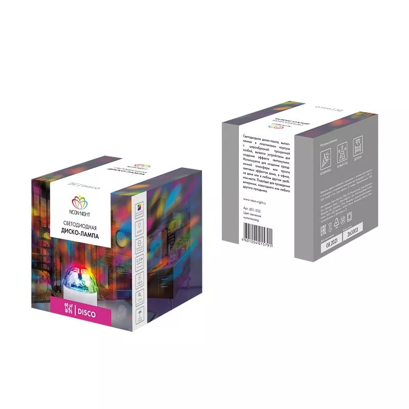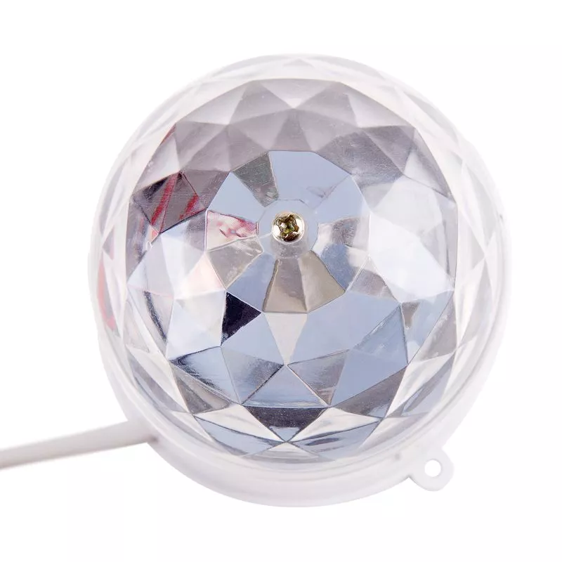 Диско-лампа в компактном корпусе работает от электрической сети с напряжением 230 Вольт, для подключения к розетке предусмотрен кабель длиной 1,5 метра со штепсельной вилкой на конце. Корпус выполнен в виде цилиндра из белого пластика. Под прозрачным куполом скрываются 6 светодиодов RGBYPW (мультиколор), которые переливаются разноцветными огнями. Верхняя часть конструкции приводится в движение моторчиком, вращающийся купол отбрасывает яркие блики на потолок и окружающие предметы. Диско-лампа создаст праздничное настроение и поможет организовать веселую вечеринку в любом месте: дома, в офисе, в кафе, на даче.