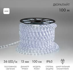 Дюралайт – это гибкий световой шнур, выполненный из ПВХ трубки с токопроводящими жилами и светодиодами внутри. Применяется для декоративной и контурной подсветки различных объектов. Также используется при изготовлении каркасных фигур и консолей. Дюралайт работает в режиме постоянного свечения. Свечение в режиме динамики возможно при приобретении контроллера (арт. 123-013). Для подключения дюралайта в комплекте поставляется блок питания. При соединении дюралайта с разъемом (муфтой) необходимо заизолировать свободное воздушное пространство разъема (муфты) морозостойким силиконовым герметиком, предотвращающим попадание влаги. Сверху данного соединения необходимо использовать термоусаживаемую трубку с клеевым слоем. Дюралайт поставляется в бухте длиной 100 м. Следуя несложной инструкции, пользователь может легко отрезать и подключить отрезок дюралайта необходимой длины. Модуль резки составляет 1 м. Для подключения каждого дополнительного отрезка дюралайта понадобится дополнительный блок питания, который приобретается отдельно (арт. 124-011).