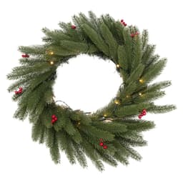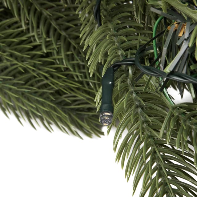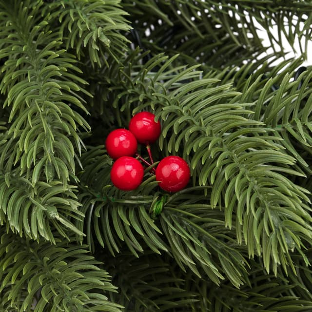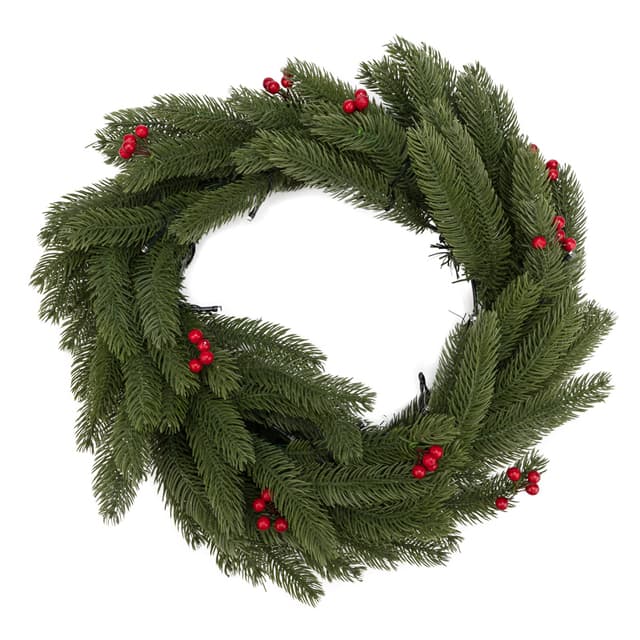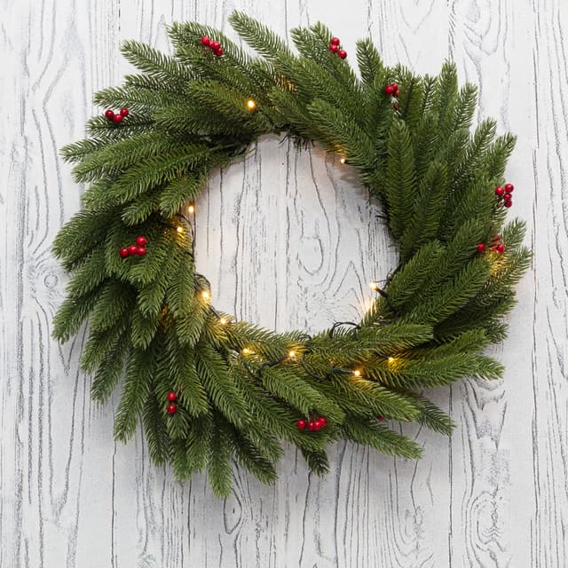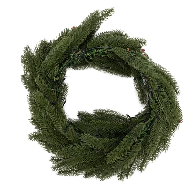 Еловый венок диаметром 45 см с ягодами и гирляндой — современный, эффектный и безопасный декор, который будет украшать ваш дом в Новый год много лет подряд. Изделие выполнено из мягкого, но прочного полимера — иголки не колются и не царапают кожу при прикосновении. Гирлянда со светодиодами красиво подсвечивает композицию, дополненную ярко-красными ягодами остролиста. Декоративный венок питается от 2 батареек типа АА, поэтому не нуждается в подключении к розетке — украшение можно повесить в любом месте.