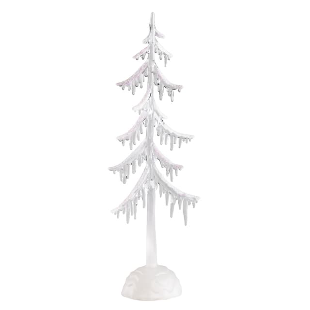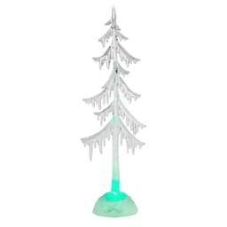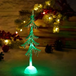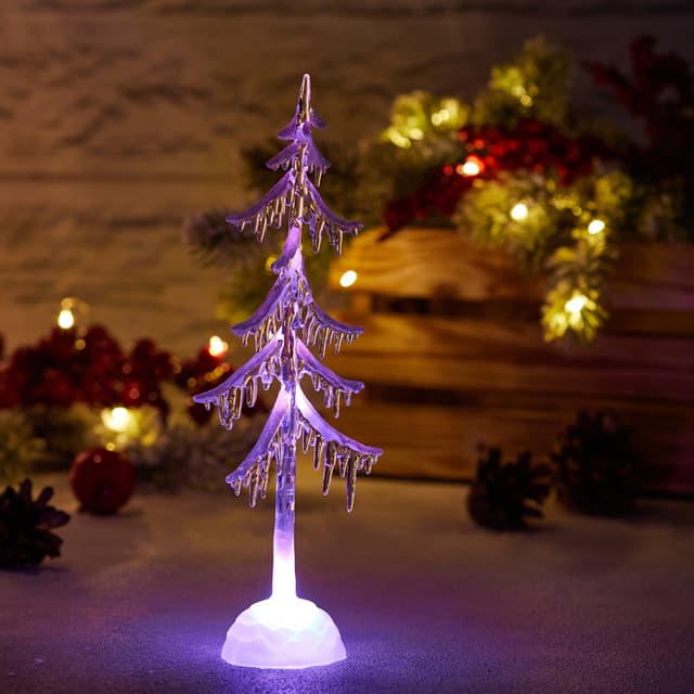 Фигура на подставке «Елочка» высотой 25 см выполнена из кристально прозрачного пластика, в нижней части находится батарейный модуль, рассчитанный на 2 элемента питания типа ААА. Один яркий светодиод RGB плавно меняет цвета в хаотичном порядке, эффектно подсвечивая дерево. Имитация заснеженных веток, проработанные детали в виде хрустальных сосулек, сверкающие разными оттенками в 256 вариациях оттенков, делают настольную фигуру оригинальным интерьерным декором, который непременно привлечет внимание окружающих.