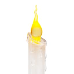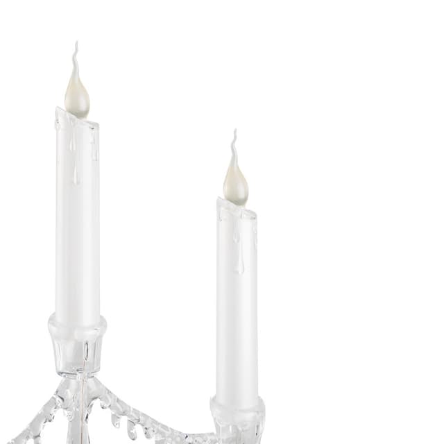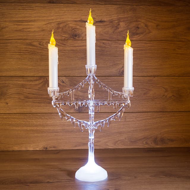 Фигура на подставке «Подсвечник со свечками» высотой 50 см — эффектный интерьерный декор, который не только гармонично украсит обстановку, но и станет полноценным функциональным предметом. 1 белый и 3 желтых светодиода создают эффект плавно движущегося огня на кончике фитилей. Питание от 3 мизинчиковых батареек (типа ААА). Композиция выполнена из белого и прозрачного пластика в виде подсвечника с 3 декоративными свечами. В нижней части подставки расположены батарейный модуль и кнопка ON/OFF.