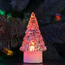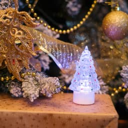 Светодиодная фигурка на подставке «Елочка средняя» высотой 10,5 см — прекрасный подарок на Новый год и Рождество, который гармонично украсит праздничный интерьер и создаст великолепное настроение. За подсветку отвечает 1 диод RGB, который меняет оттенки в гамме из 256 вариаций. Плавное перетекание цветов, яркий свет, эффектно играющий в гранях фигурки, возможность включения и выключения в любое удобное время, питание от 3 батареек типа LR44 — все это делает изделие отличным решением для оформления обстановки дома или квартиры.