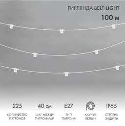 Гирлянда Белт-Лайт – это стильное решение для подсветки фасадов административных зданий, торговых центров, гостиниц, свадебных площадок, мостов и любых других архитектурных сооружений. Прекрасно подходит для создания перетяжек между деревьями или столбами в парках, садах и скверах. Также Белт-Лайт часто используется для украшения больших городских елей. Гирлянда представляет собой морозостойкий двухжильный прорезиненный ПВХ-провод, на котором расположены патроны с цоколем Е27. Каждый патрон оснащен специальным резиновым уплотнительным кольцом, сохраняющим эластичность даже при экстремальных отрицательных температурах. Благодаря уплотнительному кольцу при любом положении лампы достигается степень защиты IP65. Для подключения к сети 220В предусмотрен шнур с евровилкой. При необходимости вилку можно отрезать, подключить трансформатор на 24 В и использовать лампы на 24В (оба компонента приобретаются отдельно). Блок питания на 24В подбирается исходя из количества и мощности используемых ламп. Белт-Лайт можно разрезать в любом месте, чтобы получить нужную длину, соответствующую конкретным целям и задачам (при условии герметизации оголенного участка во избежание попадания влаги). При монтаже гирлянду необходимо крепить к металлическому тросу, так как она не является самонесущей.