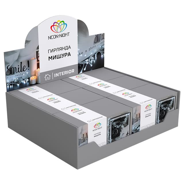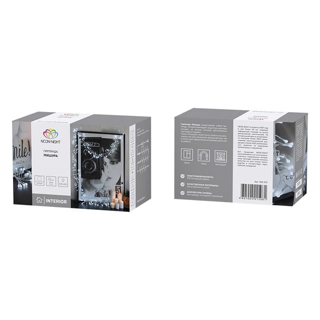 Гирлянда «Мишура» длиной 6 метров заменит традиционную елочную мишуру из фольги и станет по-настоящему эффектным украшением, привлекающим внимание к главному символу Нового года. 576 диодов, излучающих белый свет, расположены на кабеле из прозрачного ПВХ. Можно соединить до 10 гирлянд между собой и получить световой декор необходимой длины. Условия эксплуатации предполагают использование изделия в интерьере и сухих отапливаемых помещениях. За смену светодинамических эффектов отвечает контроллер с 8 режимами. Для подключения в розетку предусмотрен трехметровый питающий шнур.