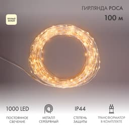 Светодиодная гирлянда «Роса» – прекрасный декоративный элемент, создающий атмосферу праздника и уюта. Это отличный способ акцентировать внимание на отдельных предметах интерьера, создать неповторимый арт-объект или использовать в качестве дополнительной подсветки. Гирлянда может эффектно подчеркнуть красоту картины, вазы с цветами, статуэтки или украсить небольшую елочку. Данный вариант имеет большую длину и трансформатор для подключения в сеть с защитой IP44, что позволят использовать его и на улице. Гирлянда состоит из тонкого провода длиной 100 метров, с расположенными на нем 1000 теплыми белыми долговечными светодиодами. Длина электрошнура 3 метра. Создайте атмосферу праздника с помощью светодиодной гирлянды «Роса»!