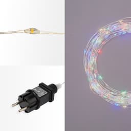 Светодиодная гирлянда «Роса» – прекрасный декоративный элемент, светящийся разными огоньками и создающий атмосферу праздника и уюта. Это отличный способ акцентировать внимание на отдельных предметах интерьера, создать неповторимый арт-объект или использовать в качестве дополнительной подсветки. Гирлянда может эффектно подчеркнуть красоту картины, вазы с цветами, статуэтки или украсить небольшую елочку. Данный вариант имеет большую длину и трансформатор для подключения в сеть с защитой IP44, что позволят использовать его и на улице. Гирлянда состоит из тонкого провода длиной 20 метров, с расположенными на нем 200 долговечными светодиодами в цвете мультиколор. Длина электрошнура 3 метра. Создайте атмосферу праздника с помощью светодиодной гирлянды «Роса»!