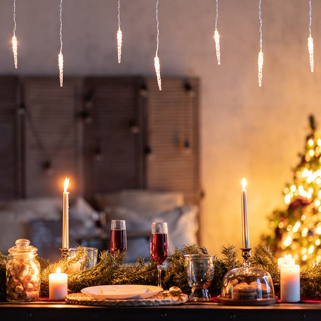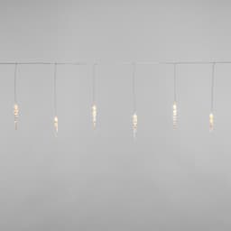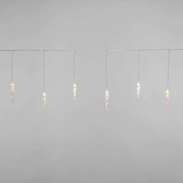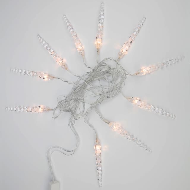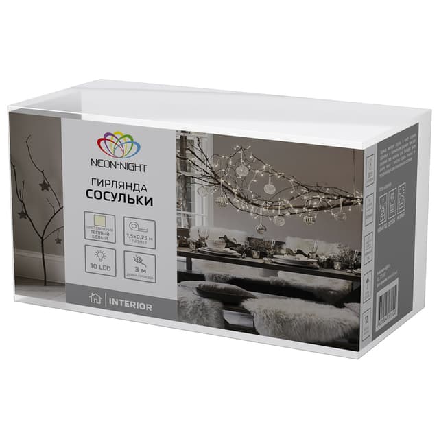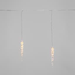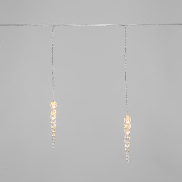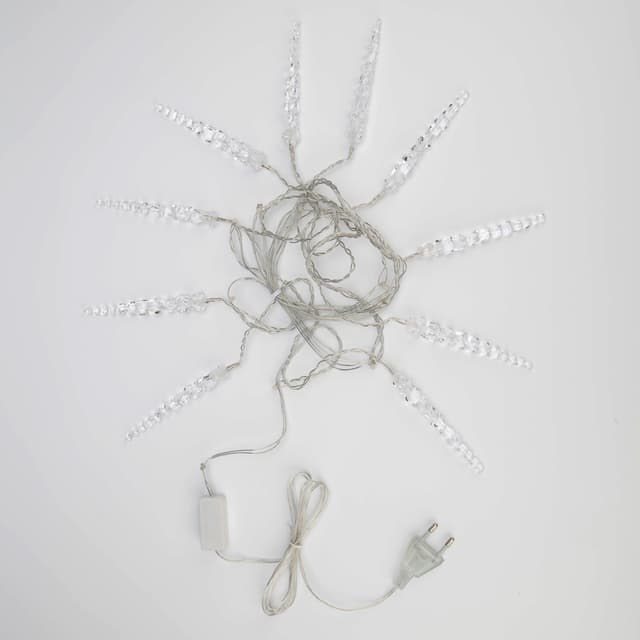 Гирлянда «Сосульки» длиной 1,5 метра работает в режиме постоянного свечения. Изделие выполнено в виде ассиметричных нитей 0,2–0,25 метра. Шнур в оболочке из прозрачного ПВХ служит основой для 10 диодов теплого белого свечения, которые скрываются внутри декоративных сосулек размером 11,5 см. Яркий свет играет в сосульках, создавая эффект сверкающего изнутри льда. Гирлянда с защитой IP20 питается от сети 230 В, для подключения к розетке предусмотрен трехметровый кабель.
