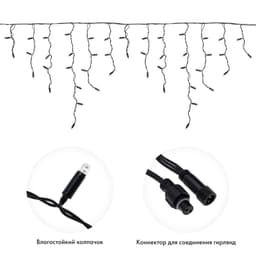 Гирлянда Айсикл (Бахрома) представляет собой гибкий горизонтальный шнур-шину, к которому через определенные промежутки крепятся вертикальные нити разной длины со светодиодами. Гирлянда имитирует сосульки и может послужить оригинальным решением при украшении карнизов, арок, фасадов зданий, витрин магазинов, а также стать эффектным элементом декора внутри помещений. Благодаря использованию светодиодов отличительной особенностью гирлянды является превосходная яркость и низкое энергопотребление. При длине 2,4 м гибкая направляющая имеет 24 вертикальные нити от 20 до 60 см. Гирлянда имеет теплый белый цвет свечения и предназначена для использования как внутри помещений, так и снаружи.