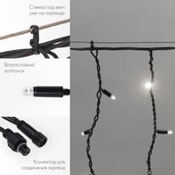 Гирлянда Айсикл (Бахрома) представляет собой гибкий горизонтальный шнур-шину, к которому через определенные промежутки крепятся вертикальные нити разной длины со светодиодами. Гирлянда имитирует сосульки и может послужить оригинальным решением при украшении карнизов, арок, фасадов зданий, витрин магазинов, а также стать эффектным элементом декора внутри помещений. Благодаря использованию светодиодов отличительной особенностью гирлянды является превосходная яркость и низкое энергопотребление. При длине 4 м гибкая направляющая имеет 32 вертикальные нити от 20 до 60 см. Данная гирлянда имеет белый цвет свечения и предназначена для размещения как внутри помещений, так и снаружи. Важной особенностью данного исполнения является каучуковый провод, благодаря которому гирлянда отличается высокой надежностью и может быть использована в условиях российского климата, даже в самых холодных регионах страны!