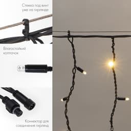 Гирлянда Айсикл (Бахрома) представляет собой гибкий горизонтальный шнур-шину, к которому через определенные промежутки крепятся вертикальные нити разной длины со светодиодами. Гирлянда имитирует сосульки и может послужить оригинальным решением при украшении карнизов, арок, фасадов зданий, витрин магазинов, а также стать эффектным элементом декора внутри помещений. Благодаря использованию светодиодов отличительной особенностью гирлянды является превосходная яркость и низкое энергопотребление. При длине 4 м гибкая направляющая имеет 32 вертикальные нити от 20 до 60 см. Данная гирлянда имеет теплый белый цвет свечения и предназначена для размещения как внутри помещений, так и снаружи. Важной особенностью данного исполнения является каучуковый провод, благодаря которому гирлянда отличается высокой надежностью и может быть использована в условиях российского климата, даже в самых холодных регионах страны!