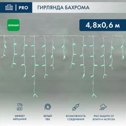 Гирлянда Айсикл (Бахрома) представляет собой гибкий горизонтальный шнур-шину, к которому через определенные промежутки крепятся вертикальные нити разной длины со светодиодами. Гирлянда имитирует сосульки и может послужить оригинальным решением при украшении карнизов, арок, фасадов зданий, витрин магазинов, а также стать эффектным элементом декора внутри помещений. Благодаря использованию светодиодов отличительной особенностью гирлянды является превосходная яркость и низкое энергопотребление. При длине 4,8 м гибкая направляющая имеет 48 вертикальных нитей от 20 до 60 см. Данная гирлянда имеет зеленый цвет свечения и предназначена для использования как внутри помещений, так и снаружи. Наличие мерцающих светодиодов белого цвета привлекает внимание и значительно преображает украшенную поверхность (мерцает каждый пятый светодиод).