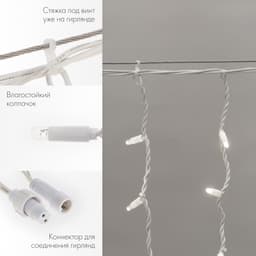 Гирлянда Айсикл (Бахрома) представляет собой гибкий горизонтальный шнур-шину, к которому через определенные промежутки крепятся вертикальные нити разной длины со светодиодами. Гирлянда имитирует сосульки и может послужить оригинальным решением при украшении карнизов, арок, фасадов зданий, витрин магазинов, а также стать эффектным элементом декора внутри помещений. Благодаря использованию светодиодов отличительной особенностью гирлянды является превосходная яркость и низкое энергопотребление. При длине 5,6 м гибкая направляющая имеет 48 вертикальных нити от 20 до 90 см. Наличие мерцающего эффекта привлекает внимание и значительно преображает украшенную поверхность (мерцает каждый пятый светодиод). Данная гирлянда имеет белый цвет свечения и предназначена для использования как внутри помещений, так и снаружи. Важной особенностью данного исполнения является каучуковый провод, благодаря которому гирлянда отличается высокой надежностью и может быть использована в условиях российского климата, даже в самых холодных регионах страны!