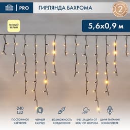 Гирлянда Айсикл (Бахрома) представляет собой гибкий горизонтальный шнур-шину, к которому через определенные промежутки крепятся вертикальные нити разной длины со светодиодами. Гирлянда имитирует сосульки и может послужить оригинальным решением при украшении карнизов, арок, фасадов зданий, витрин магазинов, а также стать эффектным элементом декора внутри помещений. Благодаря использованию светодиодов отличительной особенностью гирлянды является превосходная яркость и низкое энергопотребление. При длине 5,6 м гибкая направляющая имеет 48 вертикальных нити от 20 до 90 см. Данная гирлянда имеет теплый белый цвет свечения и предназначена для использования как внутри помещений, так и снаружи. Важной особенностью данного исполнения является каучуковый провод, благодаря которому гирлянда отличается высокой надежностью и может быть использована в условиях российского климата, даже в самых холодных регионах страны!