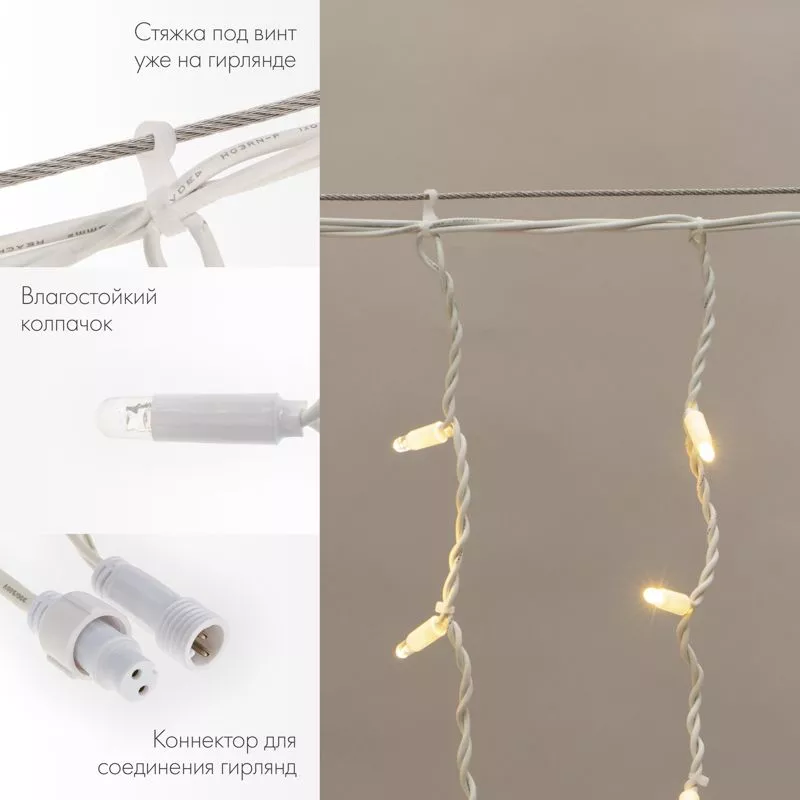 Важной особенностью данного исполнения является каучуковый провод, благодаря которому гирлянда отличается высокой надежностью и может быть использована в условиях российского климата, даже в самых холодных регионах страны!