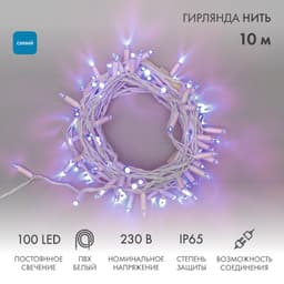 Гирлянда Нить представляет собой провод с последовательно расположенными коротенькими отводами, направленными в разные стороны. На концах этих отводов расположены яркие светодиоды. Благодаря своей универсальной конструкции гирлянда особенно подходит для украшения как уличных, так и домашних елей, а также для оформления витрин, окон, колонн, элементов интерьера и различных композиций. Также гирлянда Нить часто используется для проектов по украшению объектов разной значимости, так как ее можно соединить до 200 метров, подключив на шнур питания 303-500/303-500-1 (в комплект не входит). Гирлянда предназначена для использования как внутри помещений, так и снаружи.