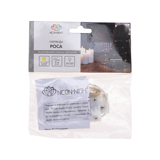 Гирлянда «Роса» служит для организации декоративного освещения, используется для подсветки предметов интерьера: цветочных композиций, бокалов, картин, столовых приборов, ваз, новогодней атрибутики, любых поверхностей. Гибкий провод запоминает заданную форму, подходит для создания сложных световых фигур. Встроенные светодиоды отличаются долговечностью и безопасностью: не нагреваются в процессе продолжительного подключения. Тонкий медный провод не изолирован от влаги, поэтому гирлянда предусматривает эксплуатацию только внутри помещения. Характеристики: Питание: 2xCR2032 4,5 В (в комплекте) Количество ламп: 20 LED Режим свечения: постоянное, без эффектов Цвет свечения: теплый белый Преимущества: Не только праздничный, но и повседневный декор Кабель допускает произвольные перегибы Надежная изоляция светодиодов Экономичность – малое потребление энергии
