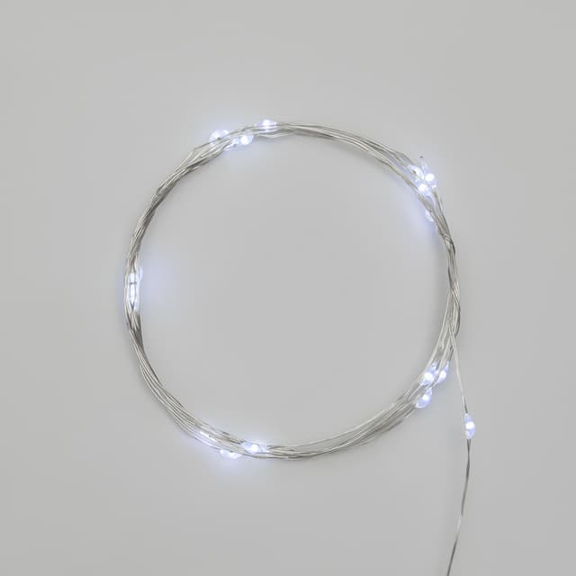 Гирлянда «Роса» длиной 2 метра с 20 безопасными, экономичными светодиодами, которые питаются от двух элементов CR2032. Гирлянда подходит для декорирования любых помещений, включая детские комнаты. Одного комплекта батареек хватает на 48 часов работы. Гирлянда излучает белый свет нейтрального оттенка. Провод с эффектом памяти позволяет создавать сложный декор без дополнительных фиксаторов.