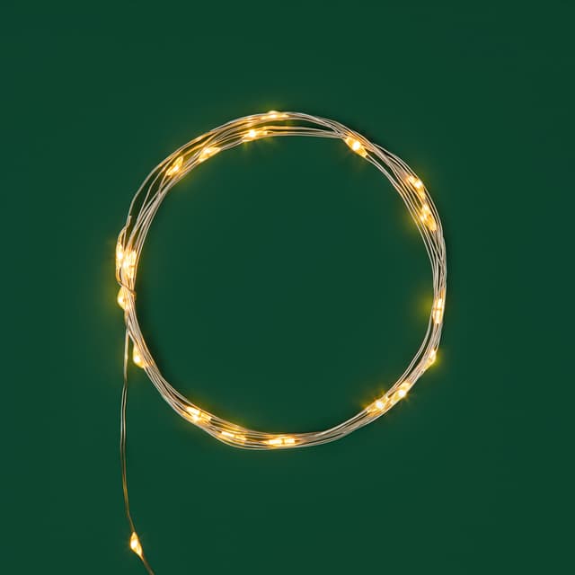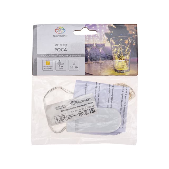 Гирлянда «Роса» длиной 2 метра питается от двух элементов типа CR2032, которые находятся в батарейном блоке на конце провода. Независимость от розетки открывает большие возможности в создании светового декора, а гибкий кабель с эффектом памяти позволяет формировать самые сложные фигуры.Благодаря абсолютной безопасности способа питания, изделие прекрасно подходит для оформления детских комнат. 20 диодов светятся яркими желтыми огнями и работают до 48 часов от одного комплекта батареек.