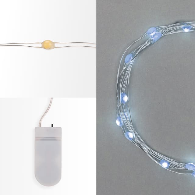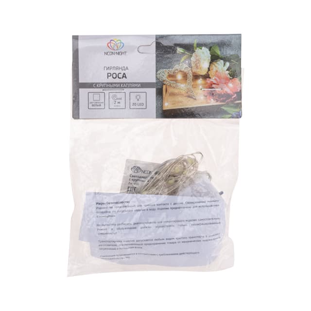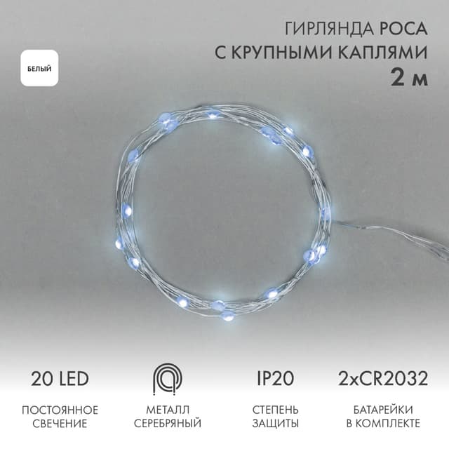 Светодиодная гирлянда «Роса» с красивыми крупными каплями – прекрасный декоративный элемент, светящийся разными огоньками и создающий атмосферу праздника и уюта. Это отличный способ акцентировать внимание на отдельных предметах интерьера, создать неповторимый арт-объект или использовать в качестве дополнительной подсветки. Гирлянда может эффектно подчеркнуть красоту картины, вазы с цветами, статуэтки или украсить небольшую елочку. Часто «Роса» украшает не только интерьер, но и с успехом применяется на торговых площадках и ярмарках для привлечения внимания к продукции. Гирлянда состоит из тонкого провода длиной 2 метра, с расположенными на нем 20 белыми долговечными светодиодами. Отличительной особенностью данной гирлянды являются более крупные диоды. В качестве питания у данной модели гирлянды выступают батарейки 2хСR2032, которые идут в комплекте. Создайте атмосферу праздника с помощью светодиодной гирлянды «Роса»!