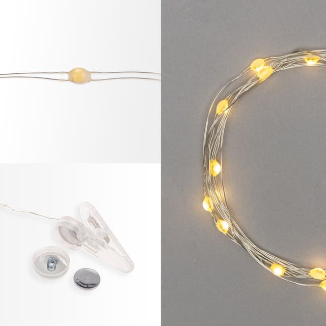 Светодиодная гирлянда «Роса» с прищепкой – прекрасный декоративный элемент, светящийся теплыми белыми огоньками и создающий атмосферу праздника и уюта. Это отличный способ акцентировать внимание на отдельных предметах интерьера, создать неповторимый арт-объект или использовать в качестве дополнительной подсветки. Гирлянда может эффектно подчеркнуть красоту картины, вазы с цветами, статуэтки или украсить небольшую елочку. Часто «Роса» украшает не только интерьер, но и с успехом применяется на торговых площадках и ярмарках для привлечения внимания к продукции. Гирлянда состоит из тонкого провода длиной 3 метра, с расположенными на нем 30 теплыми белыми долговечными светодиодами. В качестве питания у данной модели гирлянды выступают батарейки 2хСR2032, которые идут в комплекте. Создайте атмосферу праздника с помощью светодиодной гирлянды «Роса»!