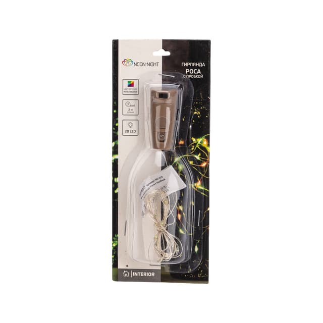 Гирлянда Роса с декоративной пробкой подходит к любой бутылке, немного фантазии – и в вашем интерьере появится оригинальный, эксклюзивный арт-объект. Такой аксессуар можно использовать в качестве ночника, декоративного элемента в интерьере или в составе необычной композиции. Гирлянда состоит из тонкого провода длиной 2 метра, с расположенными на нем 20 разноцветными долговечными светодиодами. В качестве питания у данной модели гирлянды выступают батарейки 3хLR44, которые идут в комплекте.