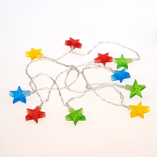Светодиодная гирлянда «Звездочки» длиной 1,5 — оригинальное и эффектное украшение, которое подойдет для оформления как новогодней ели, так и отдельных предметов интерьера: гардин, ваз, скульптур, элементов мебели. Насадки, в виде матовых разноцветных звездочек, расположены по всей длине провода и подсвечиваются 10 разноцветными диодами, питающимися от двух батареек типа АА. Гирлянда выполняет роль акцентной подсветки в отапливаемых помещениях со стандартными условиями влажности и температуры.