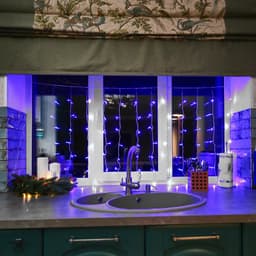 Гирлянда «Дождь» 1,5×1 м выполнена в виде занавеса, и это идеальное решение для декора окон в квартире, доме или офисе. Трехметровый шнур питания позволяет обойтись без удлинителя. Гирлянда работает при напряжении 230 Вольт и управляется контроллером с 8 разными режимами свечения: 7 динамических и 1 статический. Провод заключен в оболочку из гибкого прозрачного ПВХ. 96 диодов горят синим цветом.