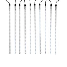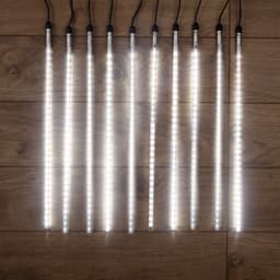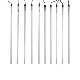 Светодиодная гирлянда Тающие сосульки – это оригинальное, красивое и современное решение для оформления деревьев или витрин. Тающие сосульки зачастую сочетают вместе с гирляндой Бахрома при украшении фасадов зданий или при оформлении растяжек. Гирлянда представляет собой готовый к использованию комплект: 10 пластиковых трубок и каучуковая шина, на которой расположены коннекторы с заглушками. На каждой трубке есть провод длиной 35см, на конце которого также находится коннектор. Для того, чтобы собрать гирлянду необходимо соединить коннектор на проводе и коннектор на шине. Подключение всех трубок необязательно – можно использовать любое количество по вашему усмотрению. Гирлянда работает от напряжения 24 В, трансформатор (блок питания) поставляется в комплекте. К одному трансформатору можно подсоединить 50 м гирлянды. Степень влагозащиты IP65 и утолщенный морозостойкий провод из каучука (резины) позволяют использовать гирлянду на улице.