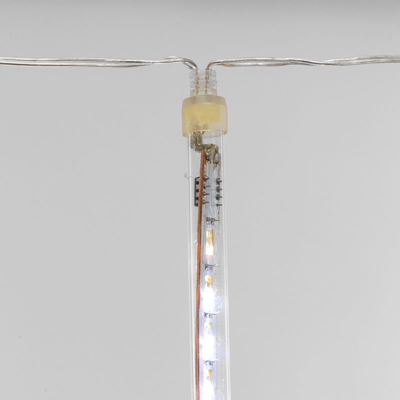 Гирлянда «Тающие сосульки» представляет собой комплект из 4 трубок длиной 20 см, выполненных из прозрачного ПВХ, внутри каждого элемента располагается двухсторонняя плата со светодиодами белого свечения. Встроенный микрочип обеспечивает эффект стекающей капли, создаваемый светодинамикой. Гирлянда работает от сети 230 Вольт, в комплект входит трансформатор. Гирлянда имеет степень защиты IP20 и предназначена для использования в интерьере и сухих помещениях с умеренной влажностью.
