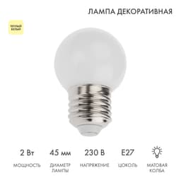 Декоративные светодиодные лампы используются с гирляндой Белт-Лайт и служат для украшения улиц, фасадов зданий и внутреннего интерьера. Колба лампы имеет форму шара диаметром 45 мм, что позволяет увеличить площадь свечения и насыщенность светом окружающего пространства. Декоративная лампа выполнена из ударопрочного поликарбоната, обладающего высокой устойчивостью к механическим повреждениям. Благодаря использованию стандартного цоколя Е27 установка лампы является простой и быстрой процедурой, не занимающей много времени. Лампы подходят для двухжильных и пятижильных гирлянд Белт-Лайт. Используя специальный контроллер можно создавать разнообразные динамические эффекты. Полная мощность для расчета нагрузки и для подбора контроллеров составляет 2 ВА.