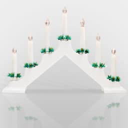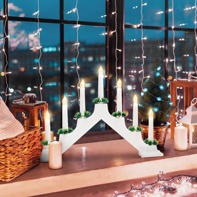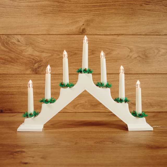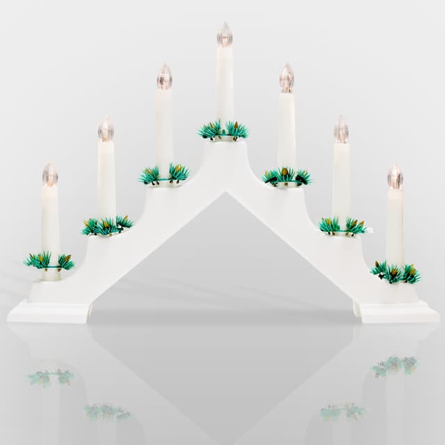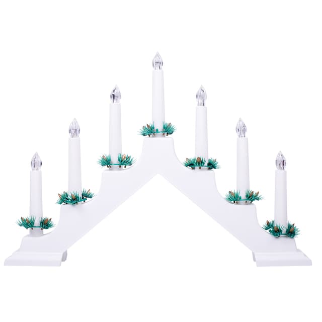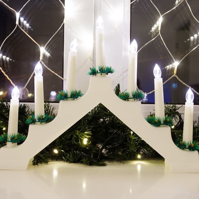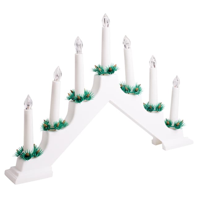 Новогодняя горка белого цвета с 7 свечками — великолепное дополнение к оформлению праздничного стола или декоративной композиции, а также отличный подарок для родных и друзей на любой из зимних праздников. Композиция состоит из 7 белых свечей, украшенных хвойными мини-венками, на Л-образной подставке. 7 экономичных ярких светодиодов излучают теплый белый свет. Для подключения к электросети предусмотрен 1,5-метровый кабель, длина которого позволяет разместить горку в любом удобном месте без использования удлинителя.