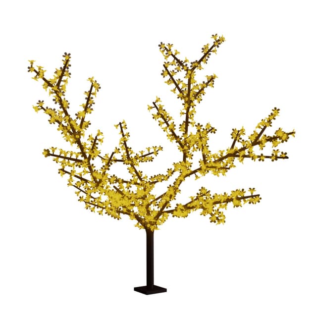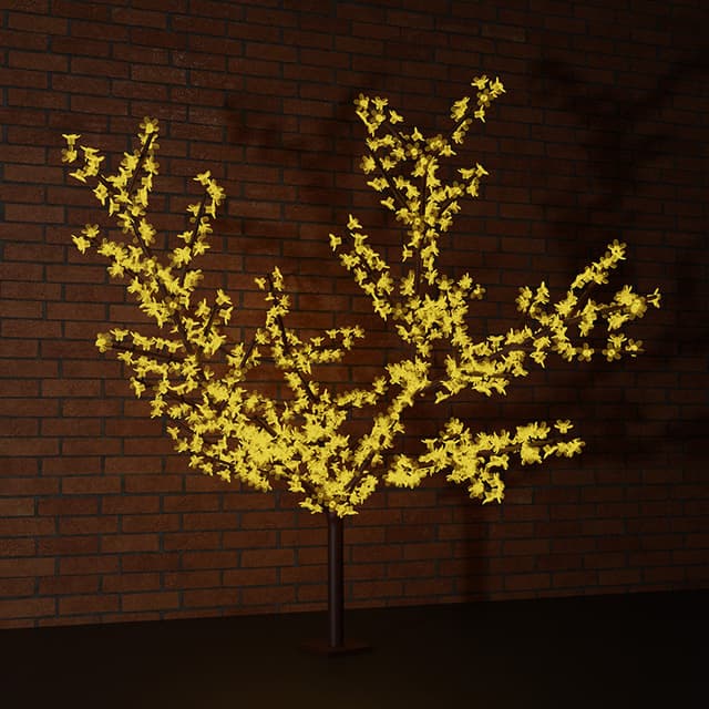 Светодиодное дерево «Сакура» высотой 2,4 метра — яркий, необычный, эффектный декор, который великолепно смотрится как в интерьере, так и в экстерьере. 1728 лепестков мерцают приятным желтым светом, красиво обрамляющим изящные ветки. Ствол и крона из черного ПВХ практически не выделяются на фоне сияющих цветов, оставляя все внимание зрелищному свечению декоративных элементов. Сборная конструкция легко монтируется и помещается в металлическое основание-подставку. Защита по стандарту IP65 исключает повреждение из-за попадания влаги, поэтому дерево можно использовать на улице даже при сильном дожде.