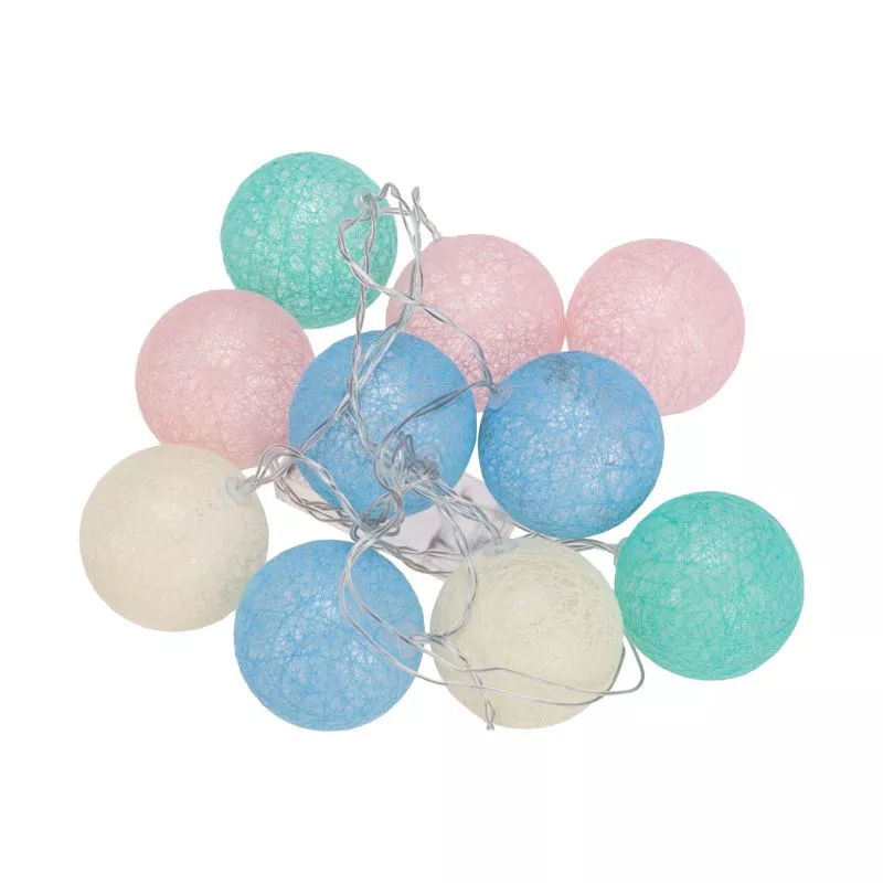 Тайские фонарики «Пудра» — светодиодная гирлянда длиной 1,5 метра, на которой расположены 10 удивительных круглых фонариков, выполненных из хлопковых нитей. Гибкий провод надежно защищен от повреждений изоляционной оболочкой из ПВХ. В качестве питания используется батарейный блок с двумя элементами типа АА, что говорит об абсолютной безопасности: гирлянду можно размещать в детских комнатах. Диоды излучают теплый белый свет, мягко рассеиваемый куполом шариков. Гирлянда прекрасно подходит для украшения интерьера и может использоваться в качестве ночника.
