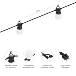 Уличная гирлянда «Лофт» выполнена на основе гирлянды «Белт-Лайт» и представляет собой готовый к использованию комплект, в котором уже установлены в патроны 20 матовых светодиодных ламп. В каждой лампе по 5 светодиодов. Изделие выполнено из электрического провода, заключенного в изоляционную оболочку из морозостойкого, гибкого и прочного каучука черного цвета. Длина провода составляет 10 метров. Гирлянда имеет защиту по стандарту IP44 – не боится попадания воды, поэтому подходит для размещения как дома, так и на улице. Диапазон рабочих температур –25...+40 °С.