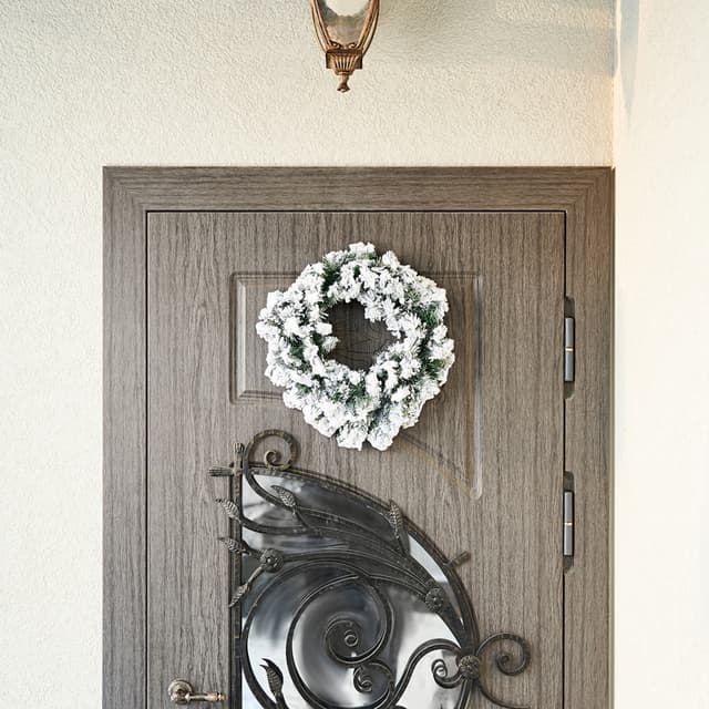 Заснеженный еловый венок диаметром 45 см — классическое интерьерное и экстерьерное украшение, выполненное из поливинилхлоридной пленки. Имитация легкого инея, покрывающего хвойные ветки с мягкими иголками, усиливает эффект реалистичности. Допускается использование не только дома, но и на улице. Еловый венок станет эффектным украшением входной двери, которое поможет почувствовать атмосферу праздника, царящую в вашем доме, прямо с порога.